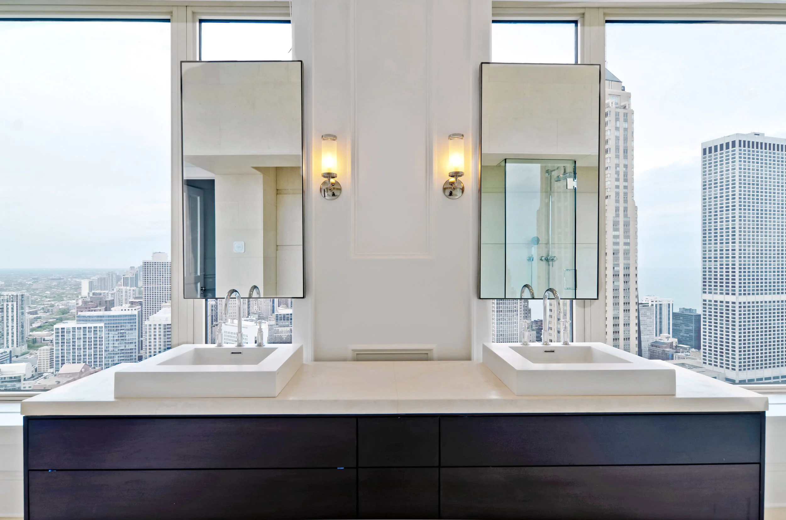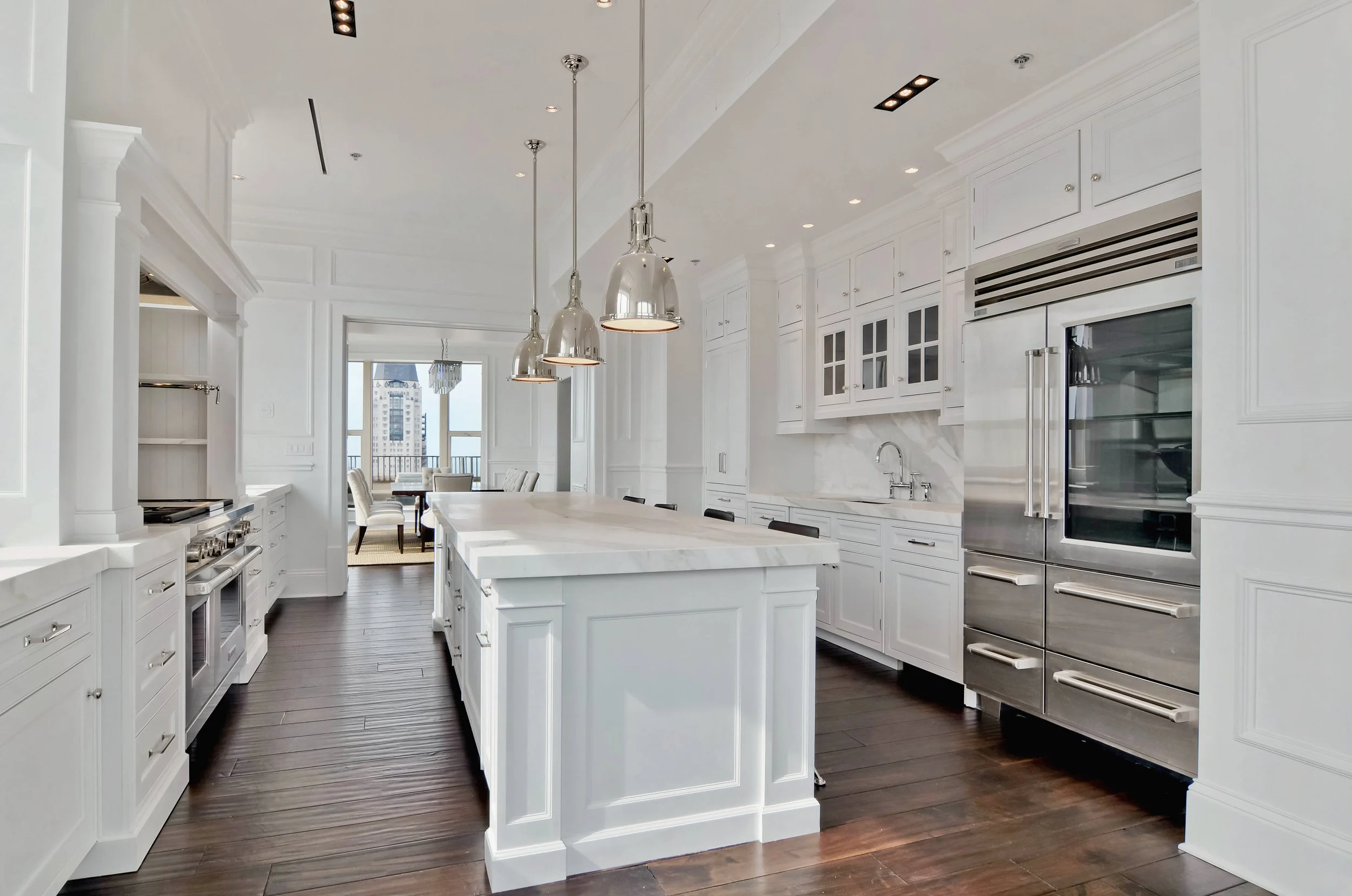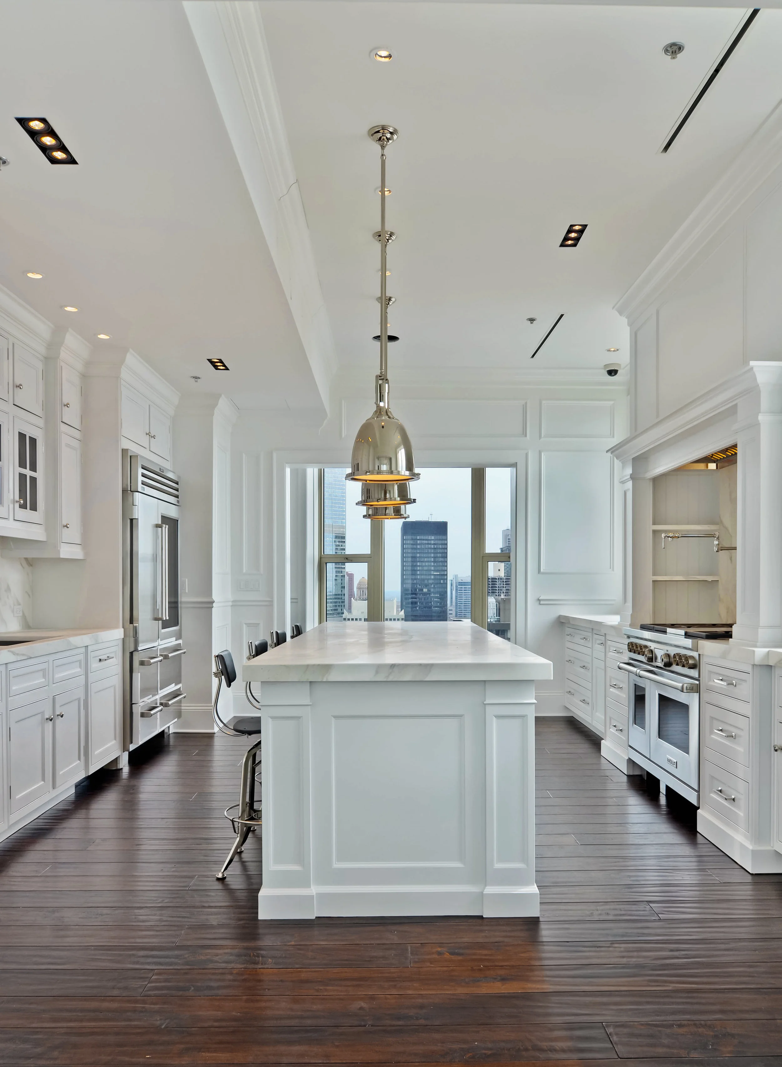bamboo tongue and groove flooring, ceramic tile floors, stained brush pine wood veneer cabinets and panels, limestone tile, natural quartz countertop, sandblasted glass panels, opaque white glass mosaic tiles.